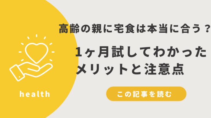 宅食 高齢の親に宅食は本当に合う?1ヶ月試してわかったメリットと注意点 親が高齢になると、食事の準備や栄養管理が一つの悩みの種になります。特に、体調が不安定だったり、家事が負担になっている場合、どうしても食事の準備が億劫になりがち。そこで注目したいのが「宅食サービス」です。 この記事では、私が実際に高齢の親に宅... 2025.09.12 2025.10.28 宅食高齢の親